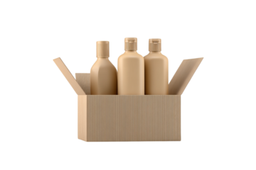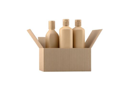 3D render of three bottles in a cardboard box mockup, with a beige and brown color palette, white isolated on a transparent background in PNG format.