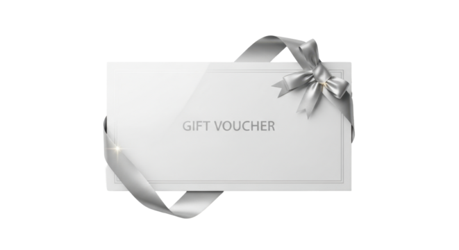 Elegant Gift Voucher with Silver Ribbon and Bow on White Background.