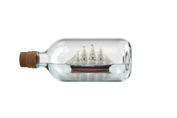 Glass bottle with cork containing a miniature sailing ship for adventure advertising.