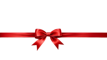 A large red ribbon bow in the centre of a long straight piece of ribbon to be used as a birthday or Christmas banner, border isolated against a transparent background