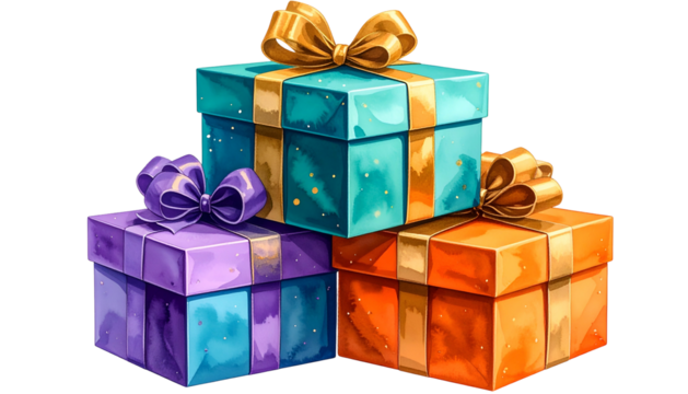 Three vibrantly colored gift boxes stacked, each adorned with a golden bow