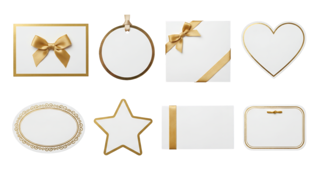 White and gold gift tag set including star, heart, oval, and rectangular shapes with ribbon bows isolated. Luxury greeting labels for holidays and anniversaries.