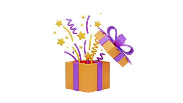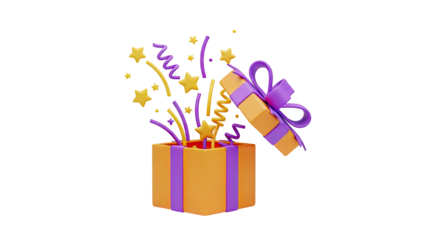 3D Open Gift Box With Confetti and Stars, Surprise Celebration on transparent background