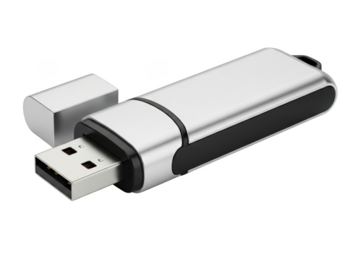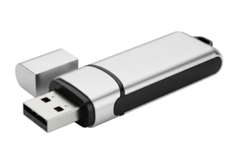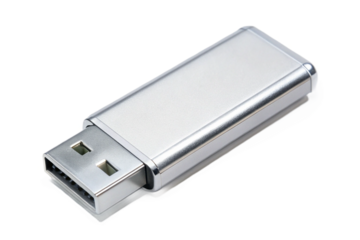 Isolated silver usb flash drive for data storage and transfer on a plain background transparent background