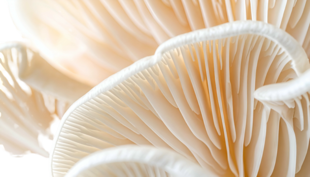 Close-up of delicate, creamy-white fungus gills, radiating soft light and texture