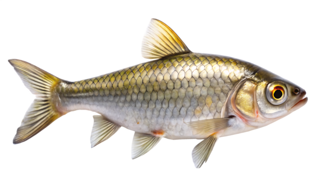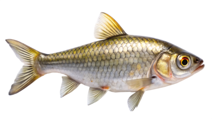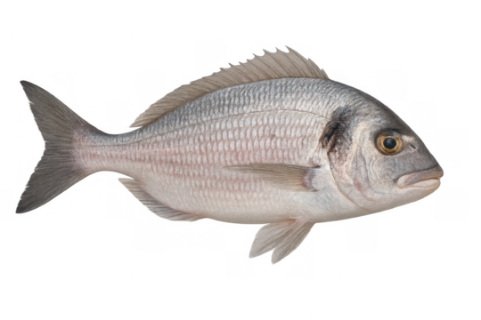 A gilthead bream fish isolated on transparent background, showcasing its distinctive golden mark on its head and its overall silvery appearance in great detail