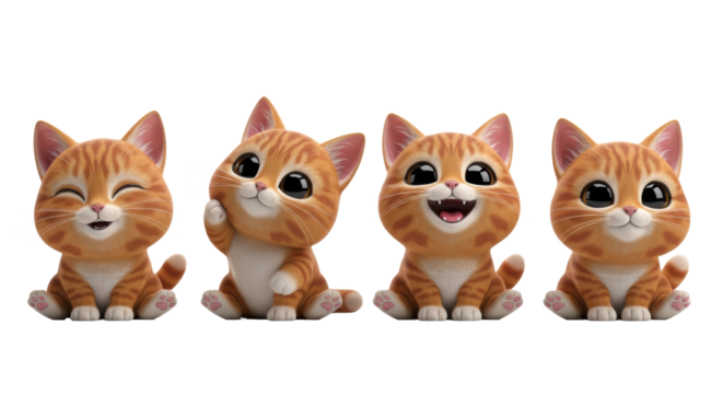 four adorable, stylized ginger tabby kitten characters with large eyes, sitting side-by-side, smooth vinyl texture, isolated on a transparent void. cute mascot collection concept