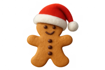 Gingerbread man cookie wearing santa hat celebrating seasonal christmas holiday, isolated background