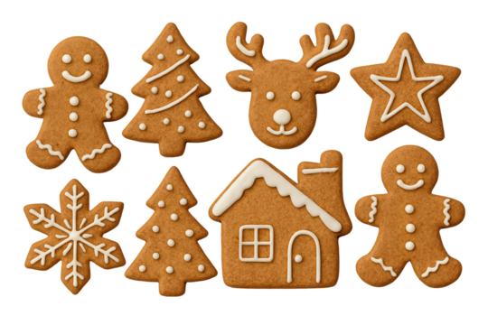 Png collection of festive gingerbread cookies with tree, star, house and reindeer shapes isolated on transparent background. concept of holiday treats, christmas bakery, winter decor.