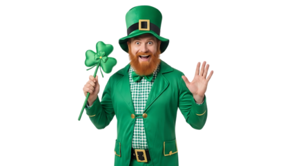 Cheerful Leprechaun Man Waving and Holding Shamrock, Wearing Traditional Green Outfit and Hat, Celebrating St Patrick’s Day with Irish Folklore and Festive Spirit