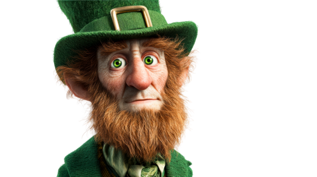 Detailed portrait of a whimsical leprechaun with bright green eyes and ginger beard, cut out transparent