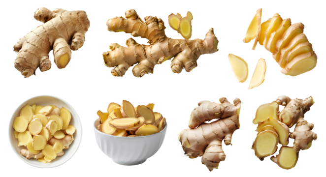 Ginger root vegetable herb, many angles and view side top front cluster pile slice isolated on transparent background cutout, PNG file. Mockup template for artwork graphic design