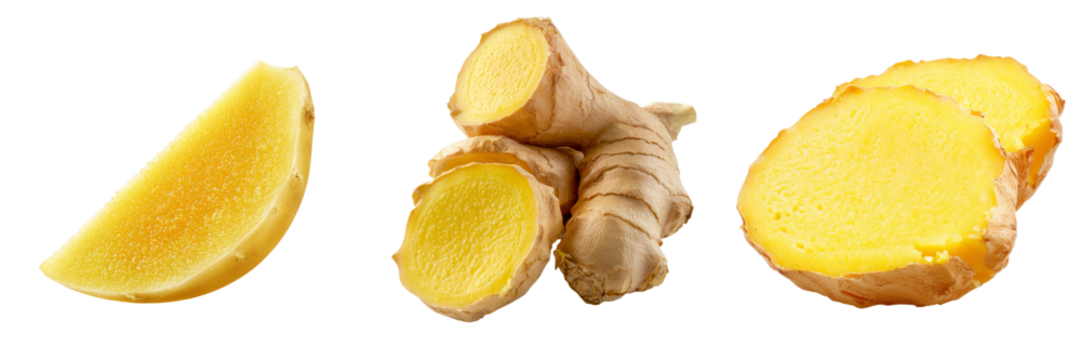 PNG,fresh ginger root cut into slices, isolated on white background