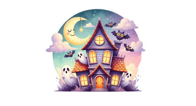 Spooky Haunted House with Ghosts and Bats Under Crescent Moon Halloween Illustration