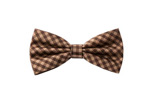 Brown gingham checkered bow tie with diagonal pattern in earth tones, isolated on a transparent background