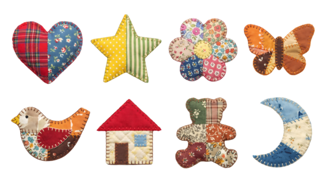 Patchwork fabric shapes set including heart, star, flower, butterfly, bird, house, bear, and moon isolated. Craft and textile sewing applique collection.