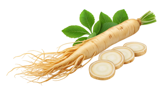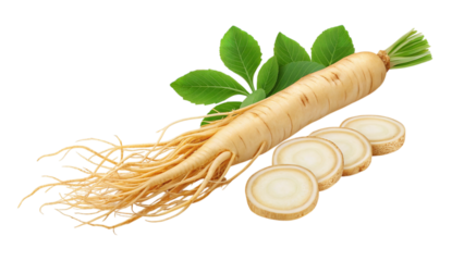 Ginseng root whole and sliced fresh ginseng with leaves for healthy food and herbal medicine concept on transparent background