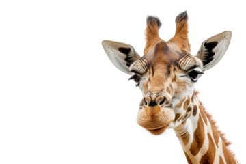 Close-up of a giraffe's head and neck on a white background. PNG transparent.