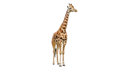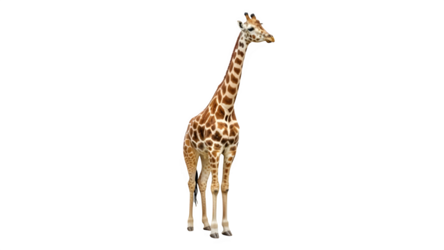 A giraffe with its head turned to the side, showcasing its distinctive neck and legs, on a transparent background