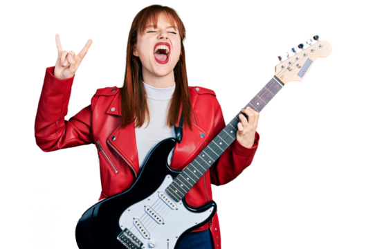 Brunette wearing leather jacket playing electric guitar on transparent background