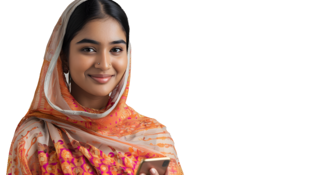 Confident woman using tablet on transparent background