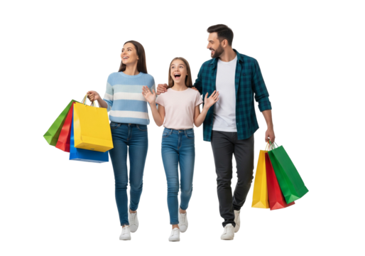Excited Family of Three Walking Together and Carrying Colorful Shopping Bags, Isolated on White Background