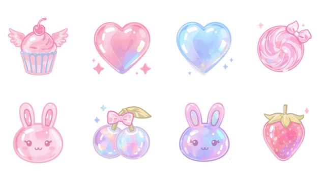 Vibrant Collection of Dreamy Pastel Iridescent Digital Icons featuring Whimsical Hearts, Adorable Bunnies, Sweet Cupcakes, and Shiny Fruits for Creative Design Projects