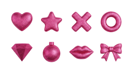 Pink glitter decorative shape set including heart, star, cross, ring, diamond, ornament, lips, and bow isolated. Girly sparkling holiday and party collection.