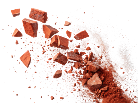 flying pieces and powder of broken red brick, cutout, PNG isolated on a white or transparent background, generated AI