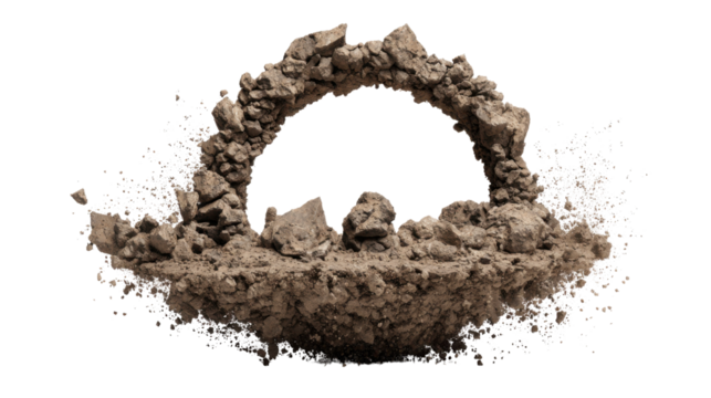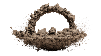 Earth shattering portal with debris and ground exploding creating an arch on transparent background