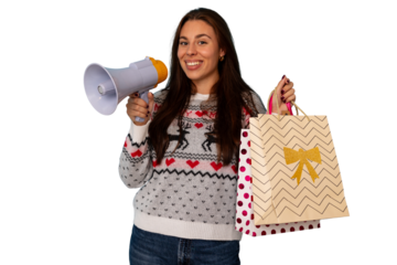 Woman holding megaphone and shopping bags, announcing christmas sale, transparent background