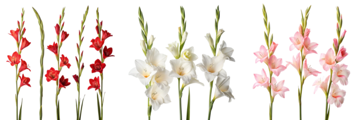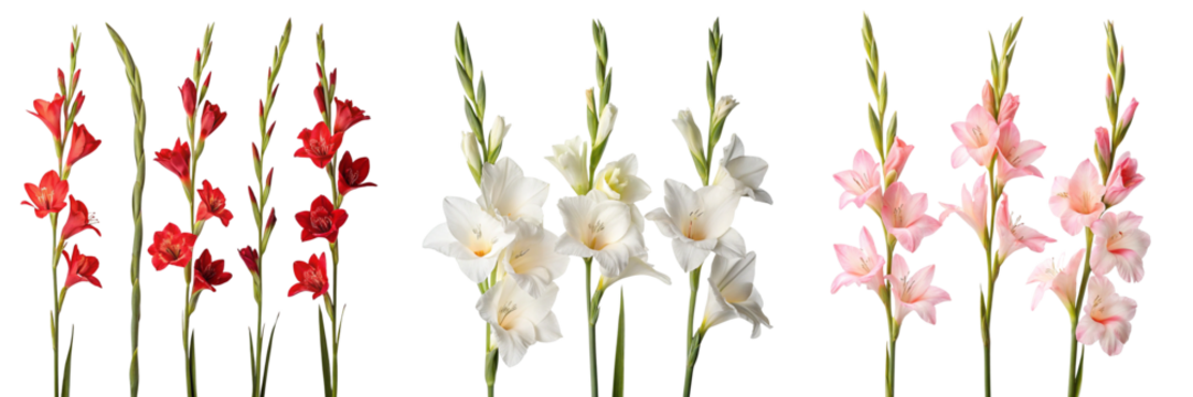 Set of Red,white,pink gladiolus flower stems isolated on a transparent background
