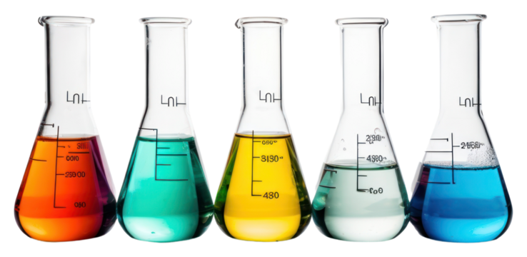 Laboratory glass beakers with liquid isolated on white isolated on transparent background