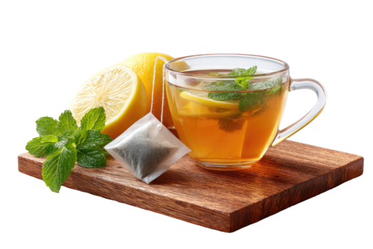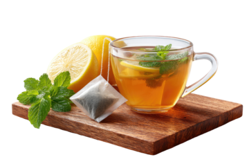A glass cup of lemon and mint tea, with tea bag and lemon slices