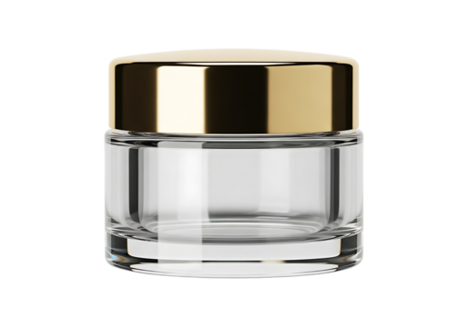 Empty glass cosmetic jar with gold lid isolated on transparent background