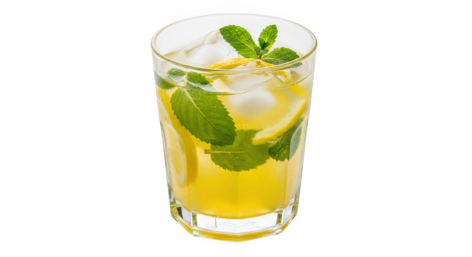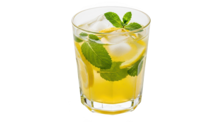 Refreshing yellow beverage with mint leaves and ice cubes in a tall glass isolated on transparent background