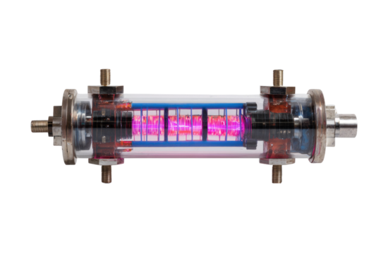 A transparent glass tube device with metal ends, featuring a glowing pink electric discharge or plasma inside a structured cage, isolated on black. background removed