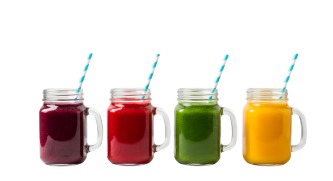 Four Colorful Smoothies in Glass Jars with Straws Isolated on transparent background