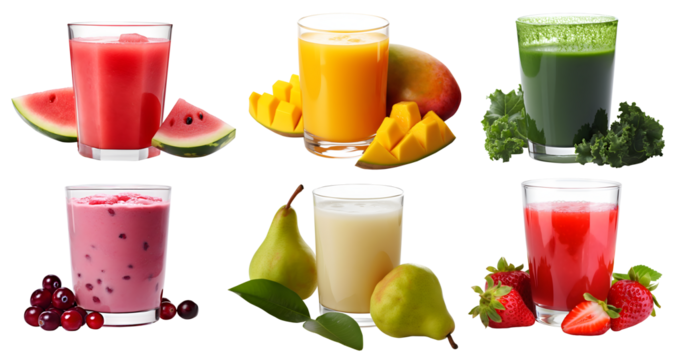 Freshly pressed Fruit vegetable juice smoothie with fruits veggie toppings on transparent background cutout. PNG file. Many assorted different flavour. Mockup template for artwork design