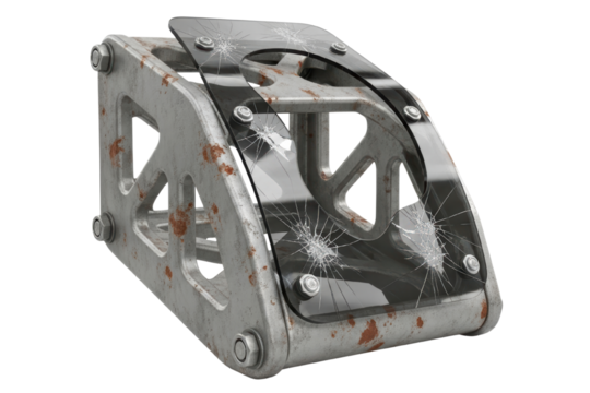Rusted industrial metal frame with shattered glass panel attached isolated on transparent background