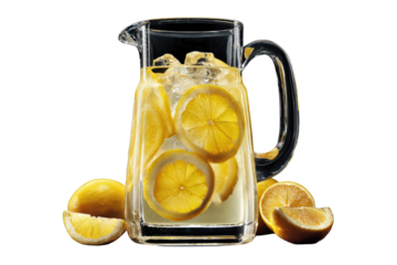Refreshing lemonade in a glass pitcher with ice and lemon slices, perfect summer drink. background removed