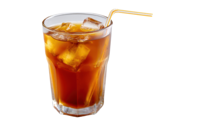 Refreshing glass of cola with ice and straw isolated on transparent background.