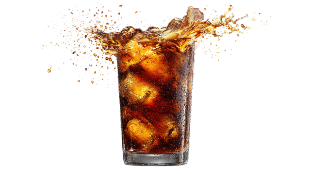 Iced coffee beverage with straw in transparent glass against a plain backdrop isolated on transparent background