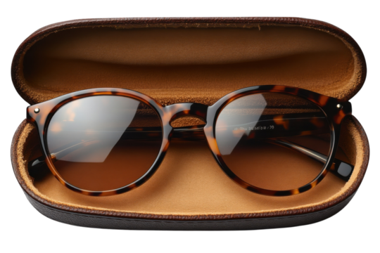 Tortoise shell glasses with gradient lenses in a brown leather case ready for a sunny day fashion