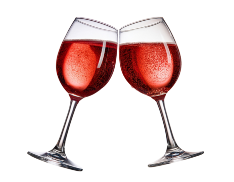 A pair of wine glasses clinking together in celebration, one with a vibrant sparkling wine and the other with a deep, isolated on white background