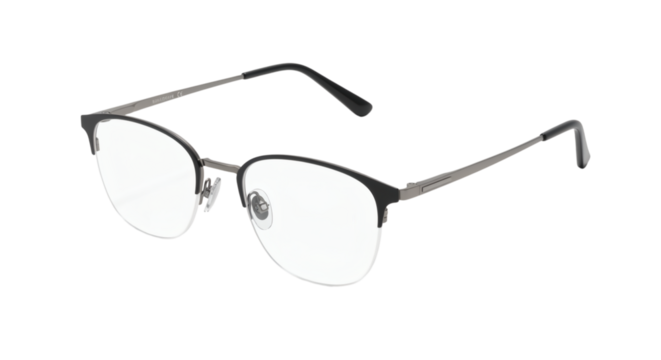 Sleek black and silver eyeglasses featuring clear lenses elegantly poised against a minimalist dark backdrop for eyewear marketing.