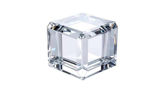 Transparent, multifaceted crystal cube isolated on black. Glimmering, refractive light creates a sparkling, glassy effect
