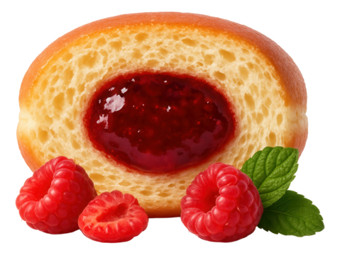 Cross-section of a donut revealing vibrant raspberry jam core.