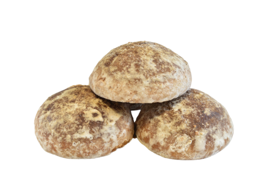 Round gingerbread cookies in sugar glaze isolated on PNG background.