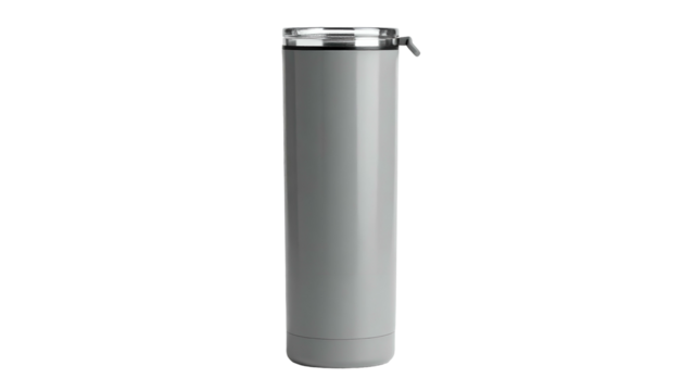 A tall, cylindrical, gray thermal container with a silver rim and a hinged lid, isolated on a black background